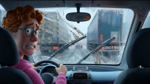 Drumul începe bine, dar vremea se schimbă rapid. Într-o depășire, un tir îi acoperă parbrizul cu noroi. Activează spălătorul, dar lichidul diluat și ștergătoarele uzate transformă totul într-o peliculă înghețată. Pentru câteva secunde, Șofi conduce fără vizibilitate. Prima sperietură serioasă.